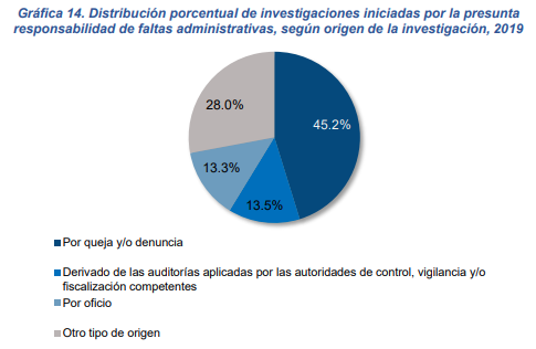 En el mismo periodo, en el ámbito nacional se iniciaron 51 833 investigaciones por la presunta responsabilidad de faltas administrativas. De acuerdo con el origen de la investigación, 45.2% provino de una queja y/o denuncia.