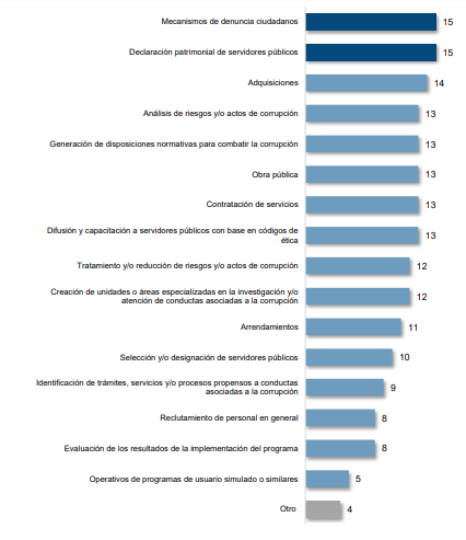 Al cierre de 2019, 17 entidades federativas contaron con un Plan o programa anticorrupción. De los temas considerados y/o atendidos en los planes o programas anticorrupción de las entidades, Mecanismos de denuncia ciudadanos y Declaración patrimonial de servidores públicos fueron los de mayor frecuencia.