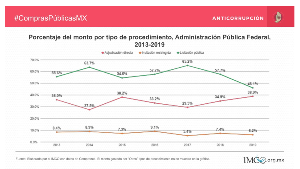 Competencia: la gran ausente Los principales obstáculos a la competencia identificados en las compras públicas fueron: *Tanto en el último año de gobierno de Peña Nieto como en el primer año de López Obrador el porcentaje de contratos por adjudicación directa fue mayor al 80%. *El porcentaje del monto adjudicado directamente en 2019, primer año del gobierno de Andrés Manuel López Obrador, fue cuatro puntos porcentuales mayor que en 2018, pasó del 35% al 39%.