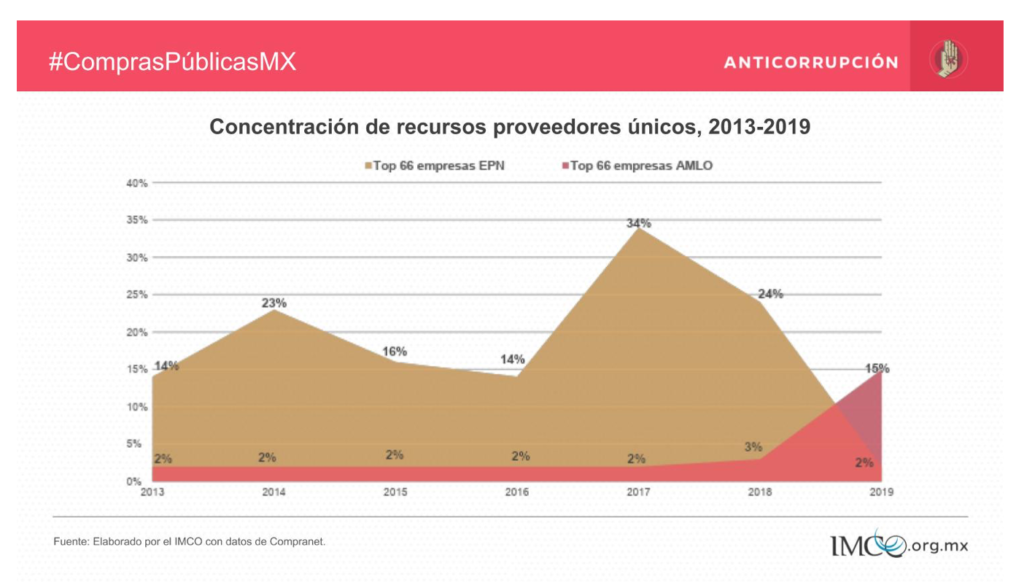 *66 de las 100 empresas que más recursos concentraron durante el sexenio de Enrique Peña Nieto dejaron de ganar contratos con la llegada a la presidencia de Andrés Manuel López Obrador. Estas concentraron el 24% de los recursos en 2018, mientras que en el 2019 ese porcentaje bajó a tan solo 2%.