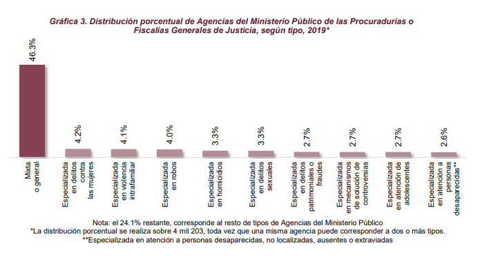 En el mismo periodo se reportaron 3 729 Agencias del Ministerio Público de las Procuradurías o Fiscalías Generales de Justicia, de las cuales 46.3% correspondió al tipo mixta o general.