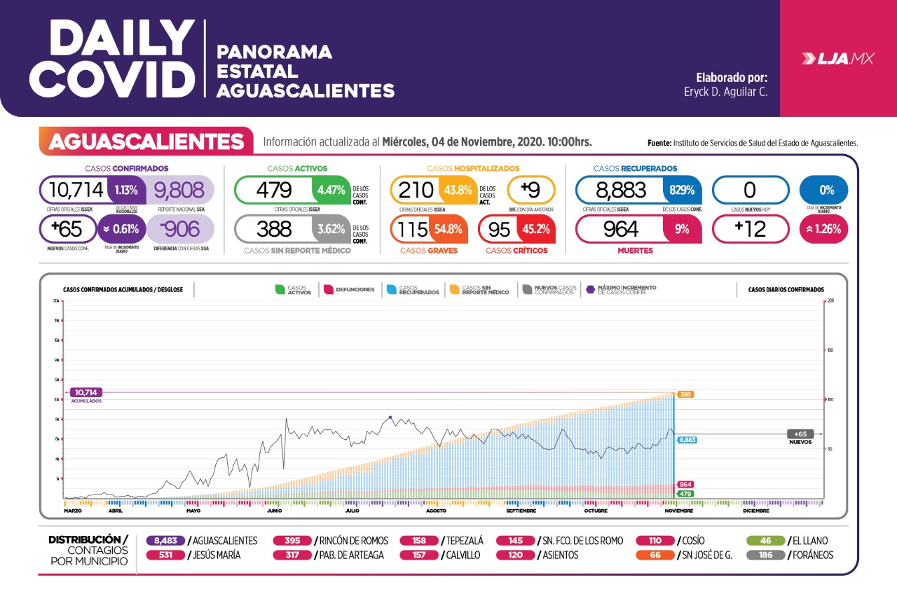 Al 4 de Noviembre, Aguascalientes sumó 12 nuevas muertes el día de hoy, elevando la tasa de letalidad de la entidad hasta 9%, con un total de 964 defunciones desde el inicio de la pandemia.