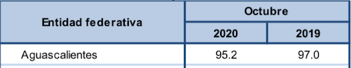 • En Aguascalientes, la tasa de ocupación al mes de octubre de 2020 disminuyó respecto 2019, de 97.00 a 95.2%