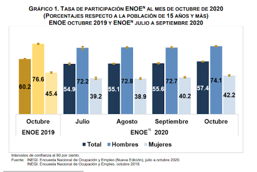 La ENOEN en octubre de 2020 reportó un incremento de 1.7 millones de personas en la PEA, con una Tasa de Participación Económica1 de 57.4% respecto a la población de 15 años y más, cifra 1.8 puntos porcentuales superior a la de septiembre pasado. Cabe destacar que las Tasas de Participación Económica de hombres y mujeres resultaron en 74.1% y 42.2%, respectivamente.