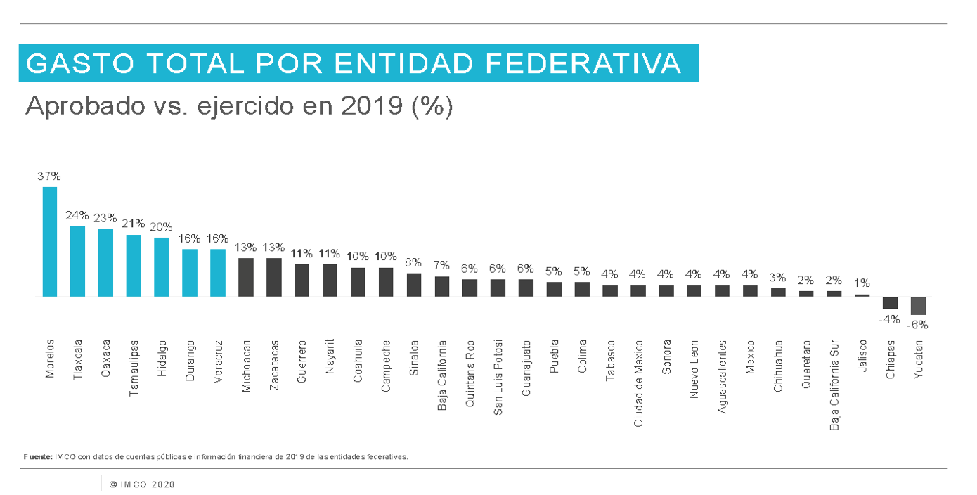 De acuerdo con la Organización de las Naciones Unidas (ONU), una variación aceptable en el ejercicio presupuestal se ubica en el rango de +/- 15%. Aplicando este criterio, encontramos que en 2019 los estados con resultados fuera del rango aceptable fueron: Morelos (37%), Tlaxcala (24%), Oaxaca (23%), Tamaulipas (21%), Hidalgo (20%), Durango (16%) y Veracruz (16%).