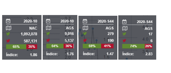 El estado de ánimo de los tuiteros, ha decaído en la medida que la pandemia se ha estado haciendo presente en México. El índice llegó a bajar a valores de 1.6 durante el mes de marzo, pero ha venido logrando acercarse al 1.9 durante el mes de octubre del 2020. Su máximo valor histórico del 2015 a la fecha fue en febrero del 2016 con 2.5 puntos, con 71 tuits con carga positiva contra 29 de carga negativa.