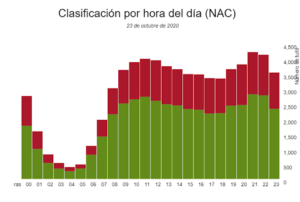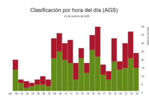 En México, durante el día pueden incrementarse la cantidad de mensajes y presentar, según la hora, diferentes estados de ánimo. Mejoran los estados de ánimo al final de la jornada diaria, tanto como el número de mensajes, pero se aprecia cierta armonía en su comportamiento. En el caso de Aguascalientes, la cantidad y el estado de ánimo es muy variable, con ligeros picos positivos a la hora de la comida pero con presencia de tuits negativos alternados con baja y alza de emisiones permanentes.