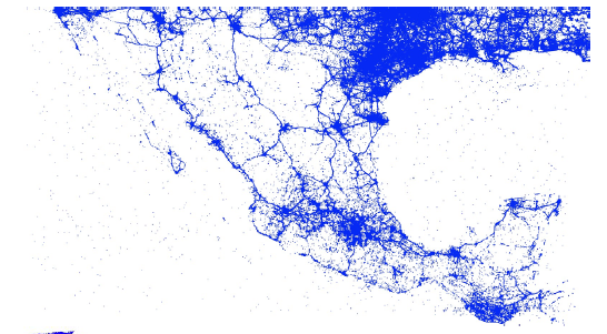 Inegi ha recolectado tuits públicos y georreferenciados dentro del territorio nacional, la parte sur de los Estados Unidos de América y norte de Centroamérica. Nótese la densidad de mensajes enviados desde la zona Centro y Bajío Occidente del país.