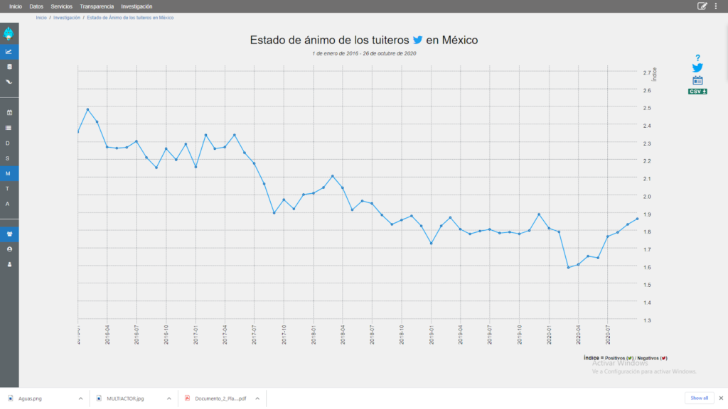 El “cociente de positividad” es un indicador definido por el número de tuits positivos y negativos que recoge el INEGI de todos los estados del territorio nacional, para medirlo, utilizan una computadora programada con base en big data para clasificar “la carga emotiva” de cada mensaje: positivo, negativo o neutro.