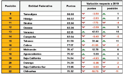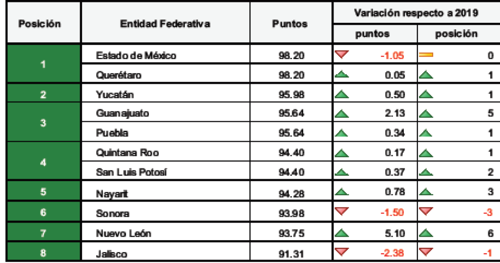 Si el promedio nacional es de 78.40% solo aprueban en verde 8 entidades de las 32. Aguascalientes obtiene un modesto 75.62%. Sin embargo, respecto a la evaluación previa, la de 2019, avanzó 5.89 puntos, lo que propició que se moviera 4 lugares hacia arriba en la tabla.
