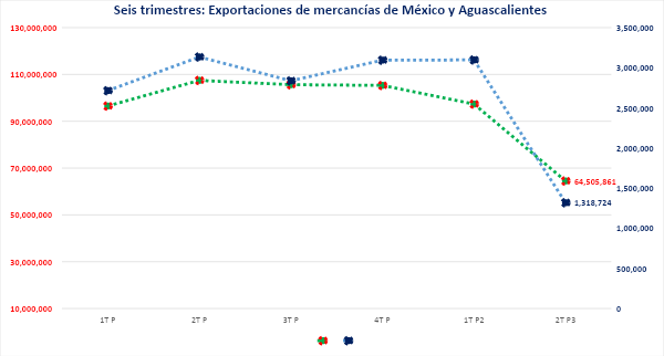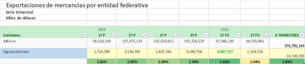 Aguascalientes es el 14 estado en exportaciones, habiendo tenido su mejor trimestre durante el primer trimestre de este año en términos porcentuales con el 3.18% de las exportaciones totales; en números absolutos lo fue el segundo trimestre del año pasado con 3,134, 595 miles de dólares 2.37 veces de lo exportado durante el segundo trimestre de este año.