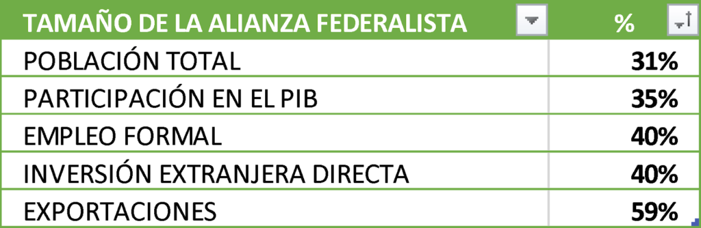 Seis de cada diez dólares contabilizados por exportaciones le corresponden a los 10 estados de la Alianza Federalista, y dos/diez dólares a los estados de la Región Centro Bajío Occidente, quinteta de entidades participantes de los 16 estados que representan el 93% de las exportaciones totales del país. Lo que significa que la mitad de las entidades únicamente aportan el 7% restante.