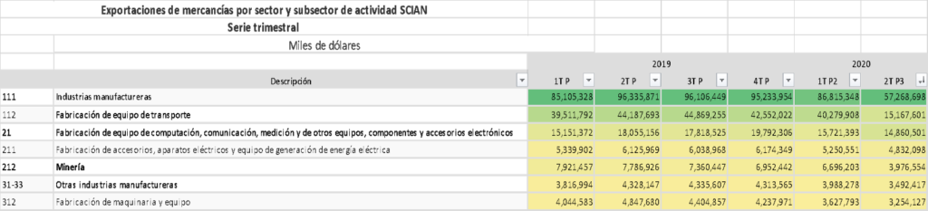 Los grandes números de la exportación mexicana de mercancías la constituyen las industrias manufactureras; particularmente las correspondientes a la fabricación de equipo de transporte y la fabricación de equipo de computación, comunicación, medición de otros equipos, componentes y accesorios electrónicos.