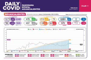 Actualmente el estado de Aguascalientes se encuentra en repunte de casos y hospitalizaciones por COVID-19. El día de ayer hubieron 11 nuevos decesos. En los últimos 4 días se registraron 45 muertes, esto ha aumentado la tasa de letalidad a 9.05%. Hay 479 casos activos confirmados y 213 hospitalizaciones.
