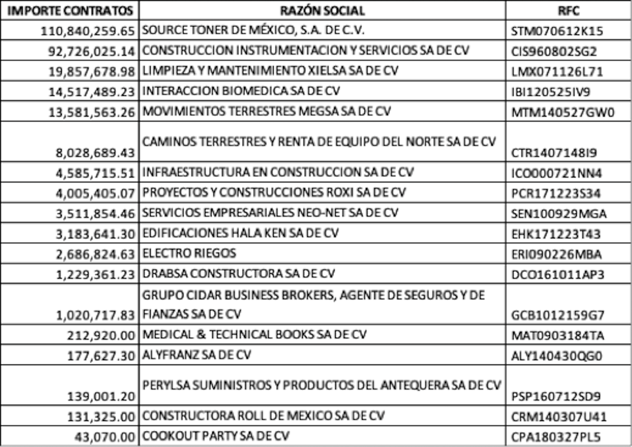 En total, esta administración federal ha otorgado 70 contratos a 18 “empresas fantasmas”, con el estatus de “presuntas” o “definitivas”, por un monto de 280 millones 479 mil 169 pesos. Las compañías han vendido sus productos o servicios al ISSSTE, IMSS, SCT, API-Progreso, Comisión Nacional Forestal (Conafor), Conagua, Exportadora de Sal (ESSA), Fideicomiso de Formación y Capacitación para el Personal de la Marina Mercante Nacional (Fidena), Colegio de la Frontera Norte (Colef), Becas Benito Juárez, Diconsa, Instituto Nacional de Pueblos Indígenas (INPI), Instituto Mexicano del Transporte (IMT), Sepomex, Centros de Integración Juvenil (CIJ), Colpost, FGR e Inapesca.