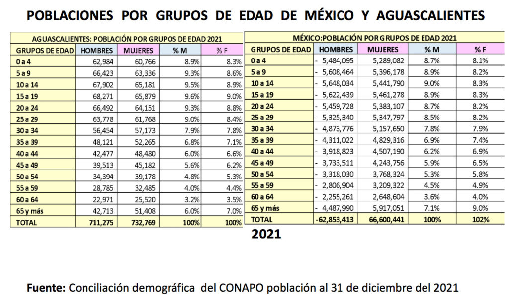 A partir del primero de enero del 2021 tendremos en Aguascalientes un millón 444 mil 044 habitantes, que representarán el 1.12% de la población nacional que ahora asciende a 129 millones 453 mil 288 de acuerdo con la recientemente publicada conciliación poblacional del Conapo. En la entidad hidrocálida, 711 mil 275 serán hombres y 732 mil 769 mujeres, lo que confirma que el índice de masculinidad seguirá siendo bajo, de 103 mujeres por cada cien varones.