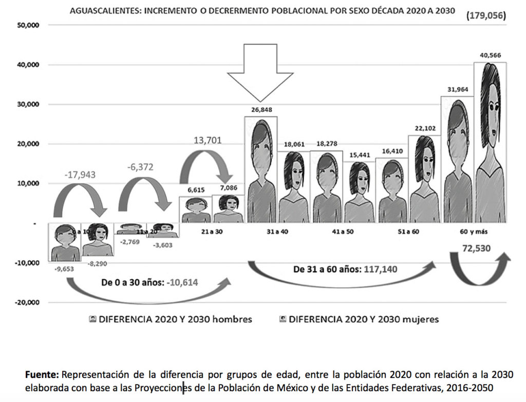 Nótese el incremento de la próxima década entre la población de 31 a 60 años por más de 60 mil efectivos masculinos y 55 mil femeninos para un aumento total de adultos por 117 mil 140 en diez años, lo que nos habla de una gran necesidad de empleos para ambos sexos. Se advierte una sobrepoblación masculina en edad de trabajar, seguramente transferida por otros estados; lo que hace suponer (en la narrativa demográfica) que se sigue apostando a que Aguascalientes continuará siendo atractor y generador de capitales productivos. (Cfr. Siguiente gráfica)