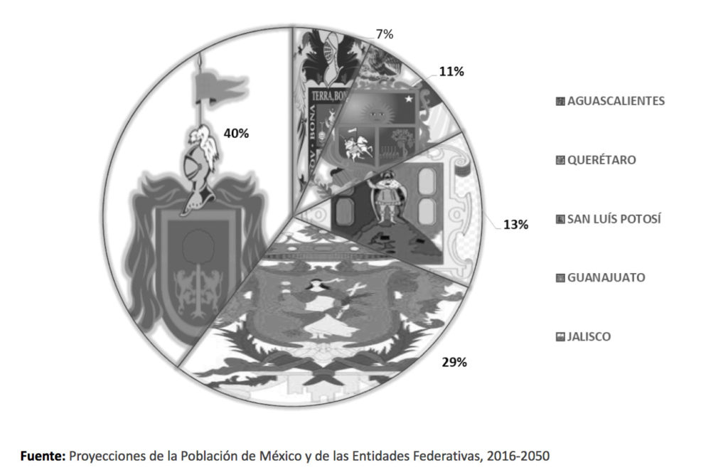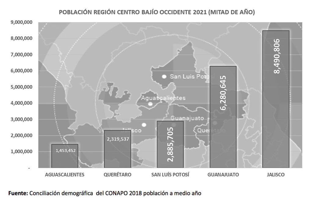 La población 2021 de la Alianza Centro-Bajío-Occidente superará los 21 millones 400 mil habitantes (17% nacional), con una fuerte presencia de elementos jóvenes demandantes de empleo y en general con más escolaridad que los del promedio nacional. Es importante señalar que la mayor cuota porcentual de cada uno de los estados, conforme a su participación general es la siguiente: más infantil en Guanajuato, más adolescente en Aguascalientes, con más jóvenes en Querétaro; la cuota porcentual de adultos es mayor en Jalisco y superior la de adultos mayores en San Luís Potosí.
