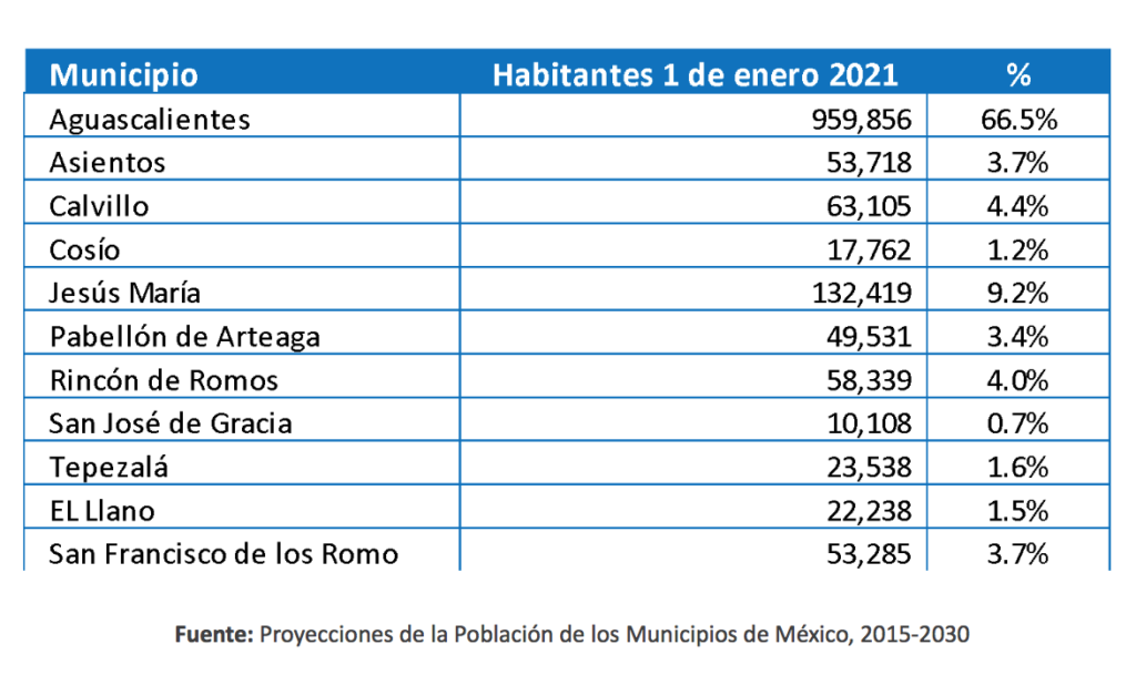 La zona metropolitana de la ciudad de Aguascalientes alcanzará en el 2021 un millón 145 mil 560 habitantes lo que representa el 80% de la población total del estado; la ZM abarca los municipios de la capital y los de Jesús María y San Francisco de los Romo.