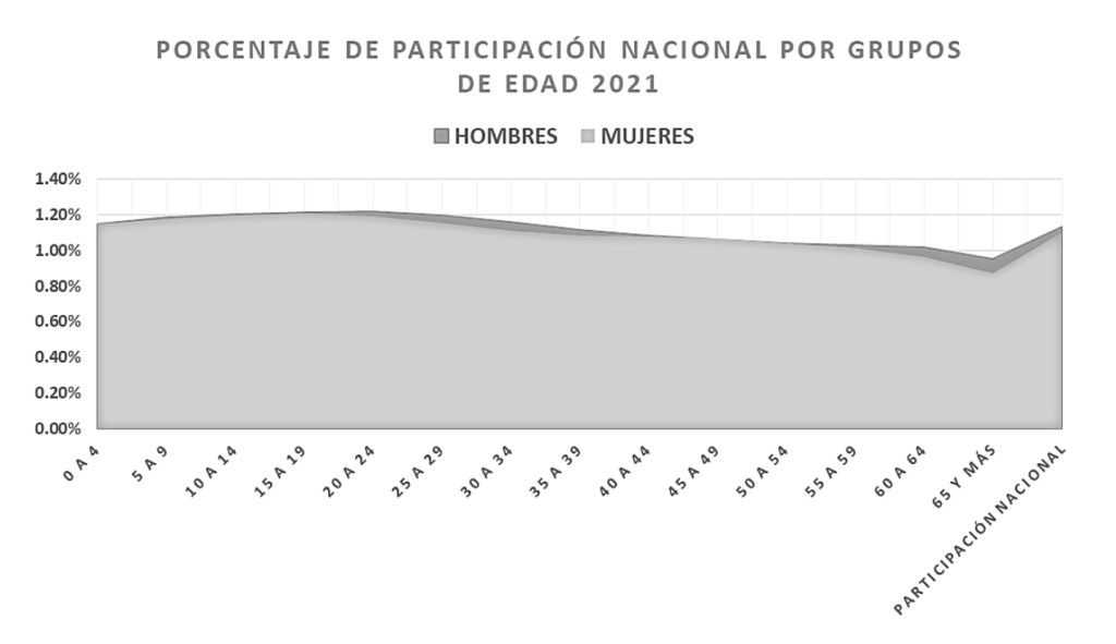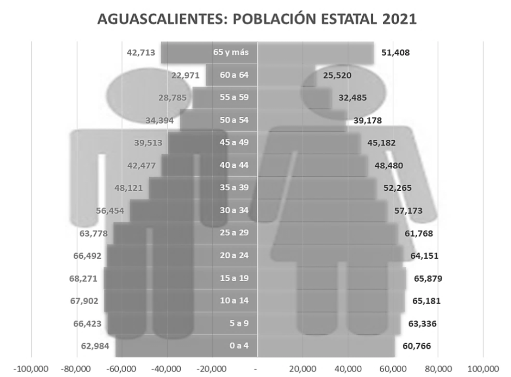 Los hombres, son mayoría entre los grupos de menores de 30 años porque nacen más niños que niñas. Se equilibran los números entre las y los jóvenes, pero en la edad adulta el sector femenino toma ventaja para ya no perderla después; tanto entre las de edades maduras como al llegar a adultas mayores, las mujeres pasan a ser una clara mayoría en Aguascalientes. Aunque paradójicamente tengamos más participación masculina entre adultos mayores a nivel nacional.