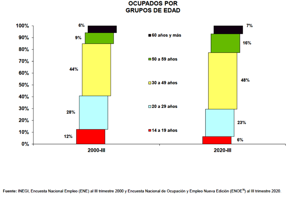 Analizando la evolución de los indicadores laborales tenemos diversos segmentos establecidos por edades, donde los cambios más importantes se han dado en los dos grupos extremos. Veamos, por un lado, el grupo de jóvenes de entre 14 y 19 años ha reducido su porcentaje de participación a la mitad, pasando del 12% al 6% en 20 años; los grupos de 20 hasta los 49 años conservan un porcentaje semejante de participación (71%). Pero, a partir de los cincuenta años, los adultos maduros y los adultos mayores, tienden a duplicar su participación laboral en el tiempo, durante el mismo lapso (20 años), pasó del 16% al 23%.