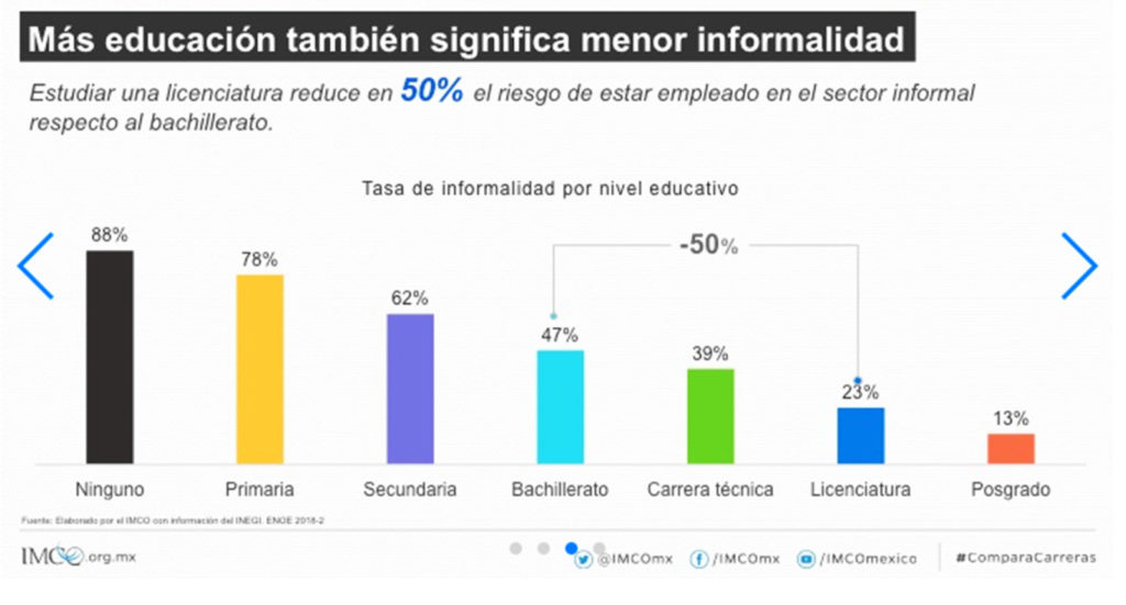 Por escolaridad o nivel de instrucción, en los últimos 19 años se ha venido modificado el perfil del desempleado: el 44% cuenta con estudios de educación media o superior, 15% más que en el año dos mil; 46% de los desocupados tienen instrucción secundaria y sólo 10% cuentan con primaria o están sin instrucción, cuando en el 2000 eran 29 de cada cien.