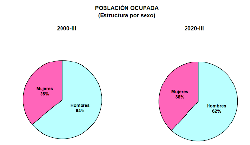 En la participación de hombres y mujeres, los valores de los varones vienen a la baja, tanto como los de las mujeres se comportan a la alza. Así, la tasa masculina de participación, que llegó al tercer trimestre del año 2000 al 64%, por 36% de la femenina; actualmente se encuentra en 62% por 38% modificando la pandemia la feminización del empleo en Aguascalientes.
