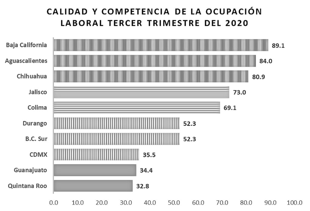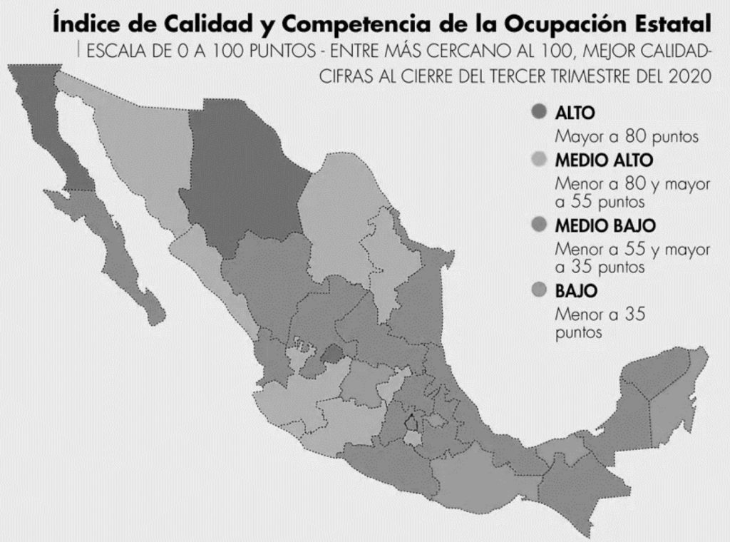 El periódico El Economista se ha dado a la tarea de analizar el estado laboral de las 32 entidades del país y de 36 ciudades con más de 100,000 habitantes, elaborando el Índice de Calidad y Competencia de la Ocupación, a partir de ocho tasas complementarias de ocupación y desocupación obtenidas de la Encuesta Nacional de Ocupación y Empleo del Inegi.