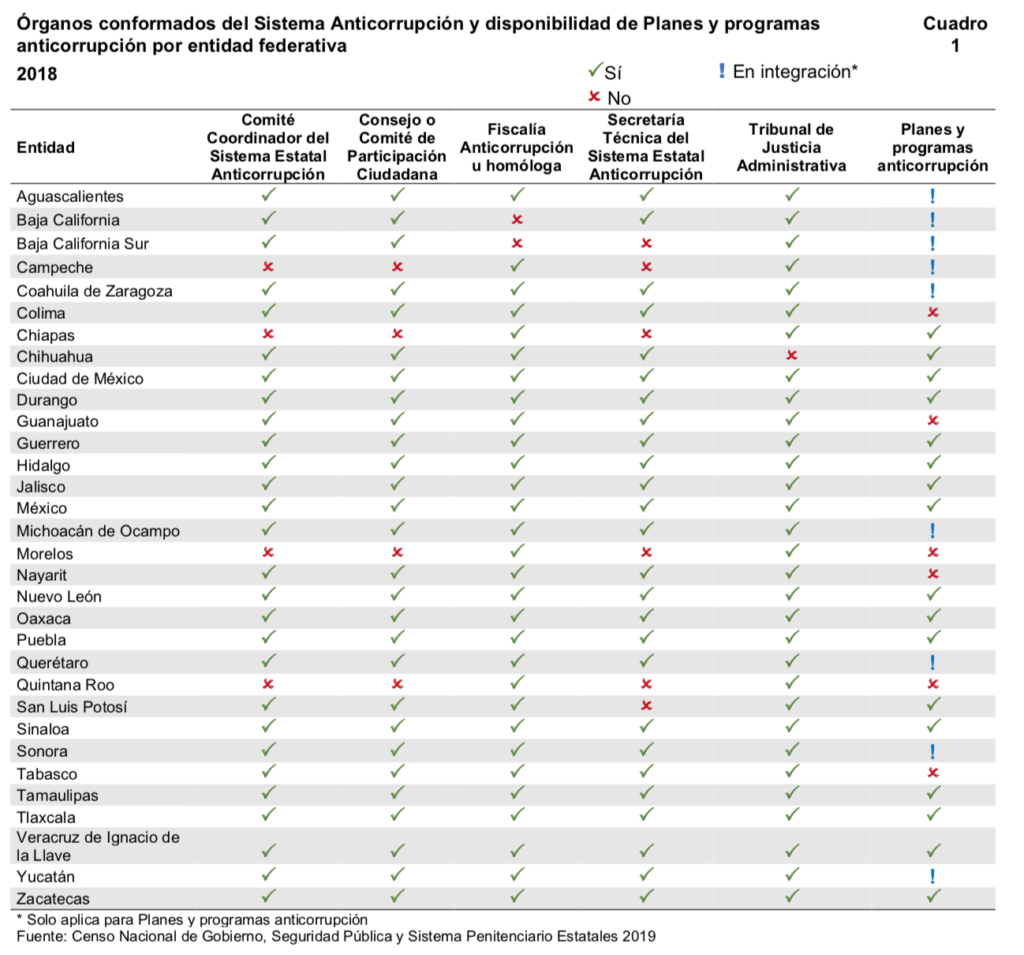 Al 2018 todas las entidades del país habían reportado avances en la conformación de los órganos que integran los sistemas locales anticorrupción. Así, tenemos que 24 entidades contaban con todos los órganos, a 3 les faltaba conformar un solo órgano, y las 5 entidades restantes estaban aún pendientes de conformar diversos órganos.