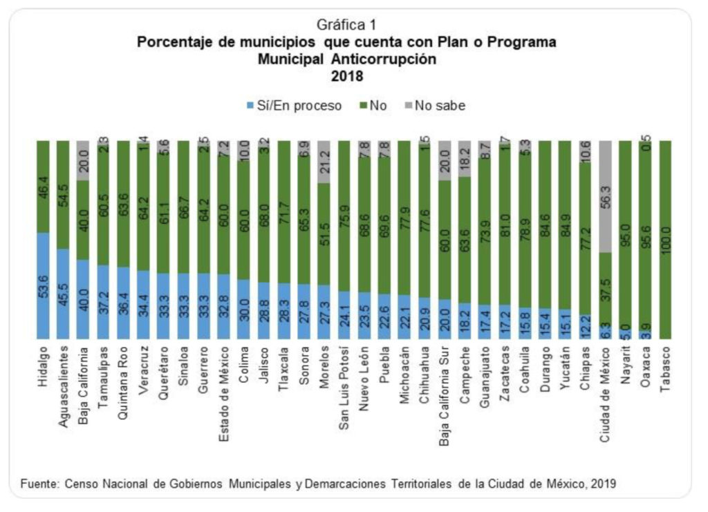 En el ámbito municipal, los avances en la implementación de planes anticorrupción han sido marginales en los últimos años. En 2010, casi 17% de los municipios reportó contar con un instrumento de este tipo, mientras que, en 2018, poco más de 20% reportó contar con plan o estar en proceso de elaborar uno.