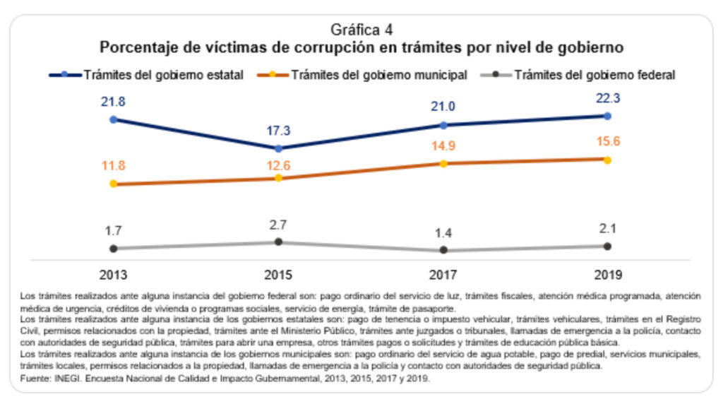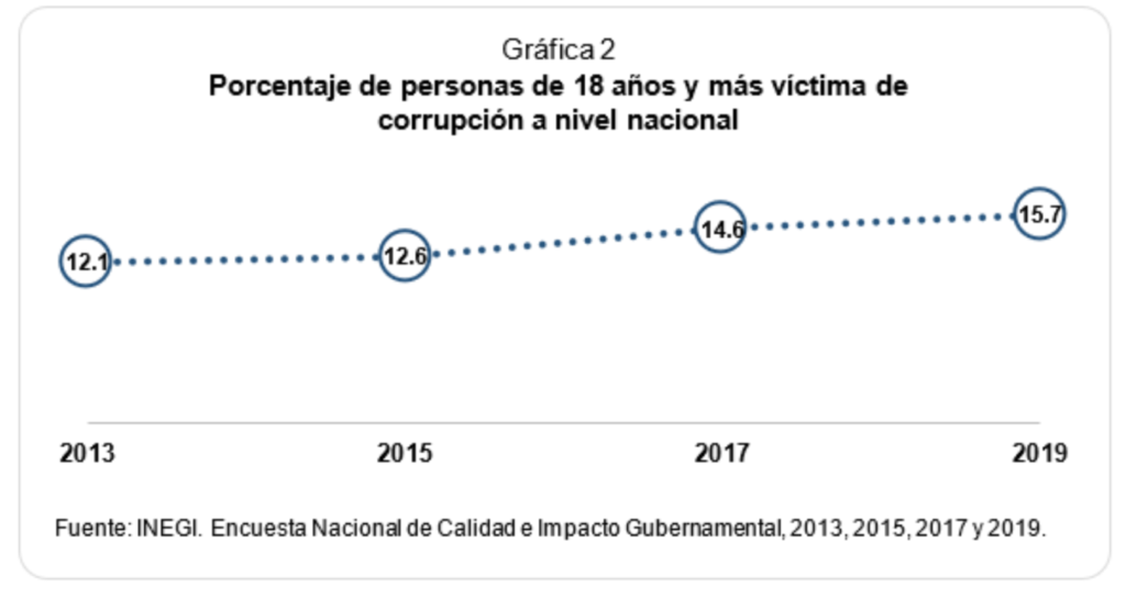 Uno de los indicadores más comunes para medir la corrupción es la prevalencia de soborno, dado que el soborno implica, en términos jurídicos, que un servidor público, por sí mismo o por medio de otra persona, solicite o reciba indebidamente para sí o para otro, dinero o cualquier otra dádiva, o acepte una promesa para hacer o dejar de hacer algo justo o injusto relacionado con sus funciones. Pese a los esfuerzos institucionales por integrar los mecanismos anticorrupción derivados de la ley o de implementar planes o programas en la materia, las cifras de víctimas de soborno al realizar trámites o al estar en contacto con alguna autoridad muestran una tendencia creciente desde 2013, de manera que en 2019 hubo tres víctimas más de corrupción por cada 100 habitantes que lo que había en 2013.