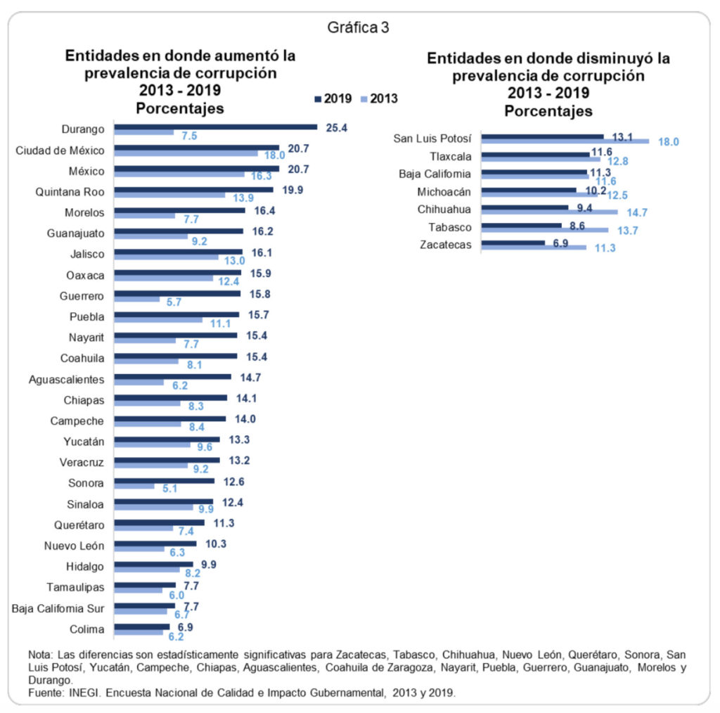 A nivel desagregado, se tiene que los actos de corrupción han aumentado en 25 de las 32 entidades en el periodo analizado, siendo Durango, la Ciudad de México y México las entidades que exhibieron las mayores prevalencias de corrupción en el país para 2019. Así, un ciudadano de estos estados enfrenta el doble de probabilidad de ser víctima de soborno (corrupción) que en Nuevo León, y el triple de probabilidades que en Colima o Zacatecas, entidades con las menores prevalencias en el ámbito nacional. Hubo varias entidades, que pese a tener un plan anticorrupción estatal operando por varios años, no muestran evidencia de que el soborno disminuya. Por el contrario, ha aumentado en los últimos años. A pesar del incremento generalizado en los niveles de soborno, hubo siete entidades que entre 2013 y 2019 presentaron una disminución en el porcentaje de víctimas de este delito, siendo San Luis Potosí, Chihuahua, Tabasco y Zacatecas, los estados donde más se redujo la prevalencia de soborno. En contraste, las entidades de Durango, Morelos, Guerrero, Aguascalientes y Sonora tuvieron en 2019 más del doble de víctimas de soborno que seis años antes.