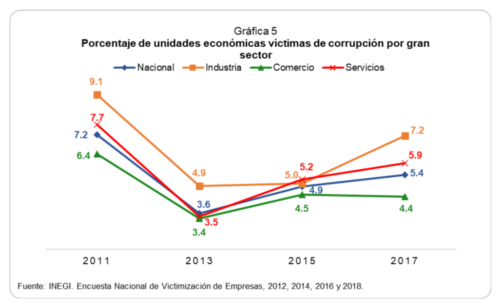 En cuanto a las experiencias de corrupción que enfrentan las empresas, la situación es similar a lo que padece la población. Si bien respecto al nivel de 2011 hubo una disminución de 1.8 puntos porcentuales en la prevalencia nacional de empresas víctimas de soborno,12 entre el periodo de 2013 a 2017 el porcentaje de empresas víctimas de corrupción aumentó de manera sostenida con una tasa de crecimiento de 50%.