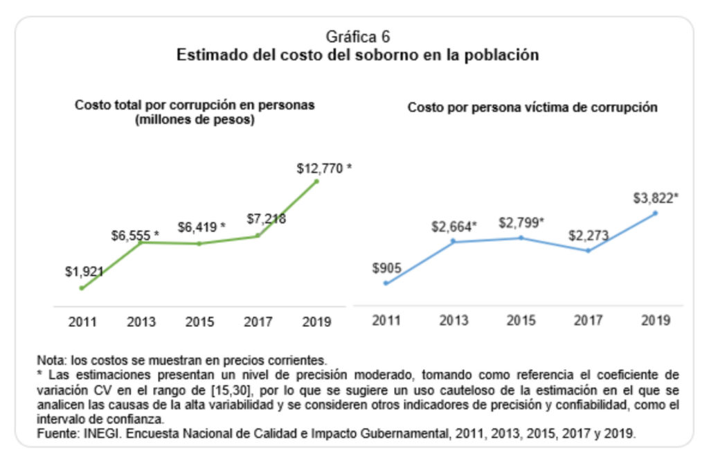 En 2019, el monto total por actos de corrupción que experimentaron las personas al realizar pagos, trámites o solicitudes de servicios públicos, y otros contactos con autoridades, ascendió a 12,770 millones de pesos, lo que representó 3,822 pesos promedio por persona afectada. A precios constantes, entre 2017 y 2019 el costo del soborno en la población aumentó 63.1% al pasar de $7,218 millones en 2017 a $11,775 millones en 2019. Acerca del costo que representa el trámite con mayor prevalencia de corrupción, es decir, la corrupción derivada del contacto con autoridades de seguridad pública, este fue de 2,244 millones de pesos en 2019, lo que significó un gasto promedio de 1,294 pesos por cada víctima.