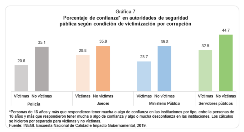 Congruente con lo que se ha observado en otras partes del mundo, los niveles de corrupción en México se asocian de manera negativa con la confianza de los ciudadanos en las instituciones de gobierno. En 2019 se encontró que el nivel de desconfianza en el gobierno fue mayor entre las personas que habían experimentado algún acto de corrupción respecto de las que no fueron víctimas.