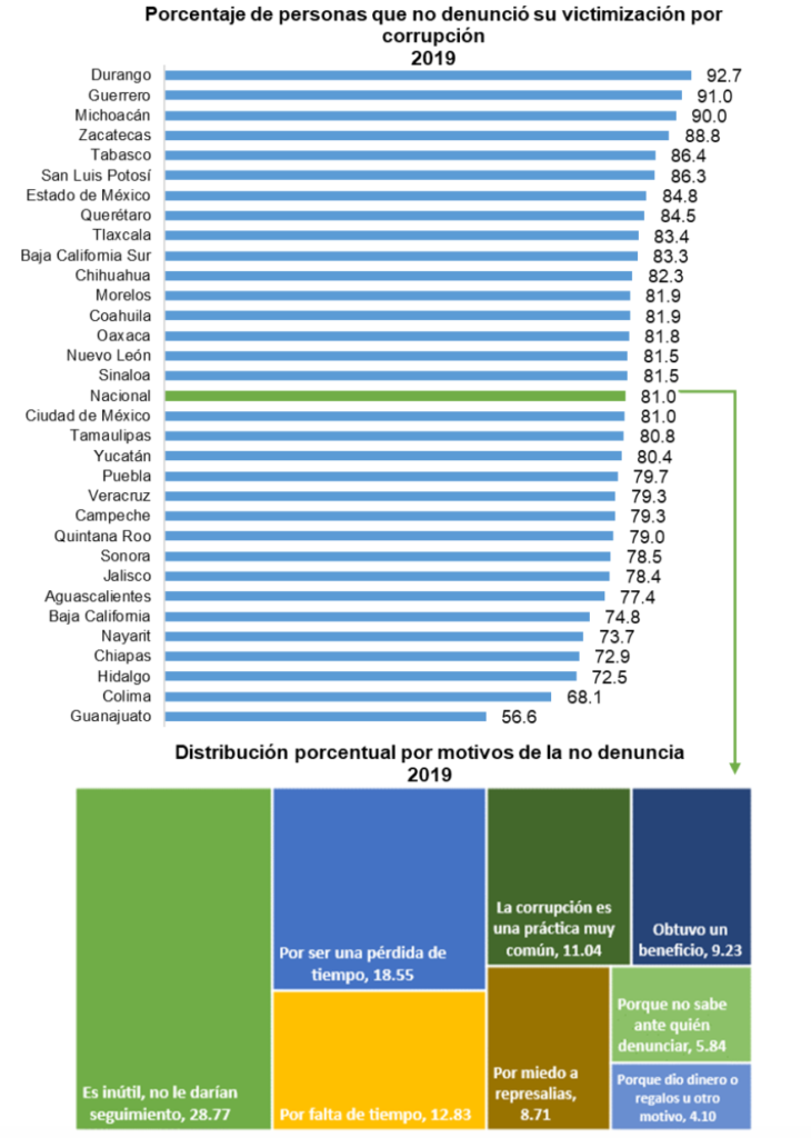 La falta de confianza se refleja también en los bajos niveles de denuncia de los delitos. Desde 2010, en México aproximadamente 9 de cada 10 delitos no se denuncian. En el particular caso del soborno, en 2019, 81% de las víctimas no denunciaron el hecho contra 5.1% que sí lo hicieron, tasa que desde 2013 se mantiene en torno a 5% de personas que denuncian. Entre las principales causas de la no denuncia se encuentran las relacionadas con la capacidad del sistema para brindar una solución, ya que de las personas que no denunciaron, 3 de cada 5 no lo hizo porque perciben que es inútil denunciar, lo consideran una pérdida de tiempo o bien, creen que la corrupción es una práctica tan común que no consideran necesario denunciar.