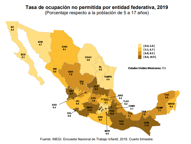 En el caso particular de la ocupación no permitida de 5 a 14 años, es decir, por debajo de la edad mínima para trabajar, de acuerdo con la reforma constitucional de 2015 que elevó de 14 a 15 años la edad mínima legal de acceso al empleo en el país, disminuyó de 6.9% en 2007 a 4.1% en 2019. Esta tasa según sexo fue de 5.5% en los niños y de 2.6% en las niñas en 2019.