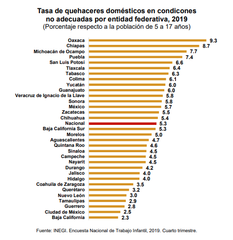 Los quehaceres domésticos en condiciones no adecuadas son aquellas actividades dedicadas a la producción de bienes y servicios para el consumo de los miembros del hogar sin remuneración que afectan la salud o integridad física de quienes las realizan, es decir, se llevan a cabo en condiciones peligrosas o en horarios prolongados. La ENTI estima para el cuarto trimestre de 2019, un total de 1.5 millones de personas de 5 a 17 años que realizan quehaceres domésticos en sus hogares en condiciones no adecuadas, cifra equivalente al 5.3% de la población de 5 a 17 años. La tasa en quehaceres domésticos en condiciones no adecuadas en el caso de los niños fue de 5% y en las niñas de 5.6 por ciento. Por tamaño de la localidad, la tasa de quehaceres domésticos en condiciones no adecuadas en áreas más urbanizadas fue de 4.1%, porcentaje que según sexo en los niños fue de 4.4% y de 3.7% en las niñas. Aguascalientes reportó en 2019 en la tasa de quehaceres domésticos en condiciones no adecuadas 4.7%.