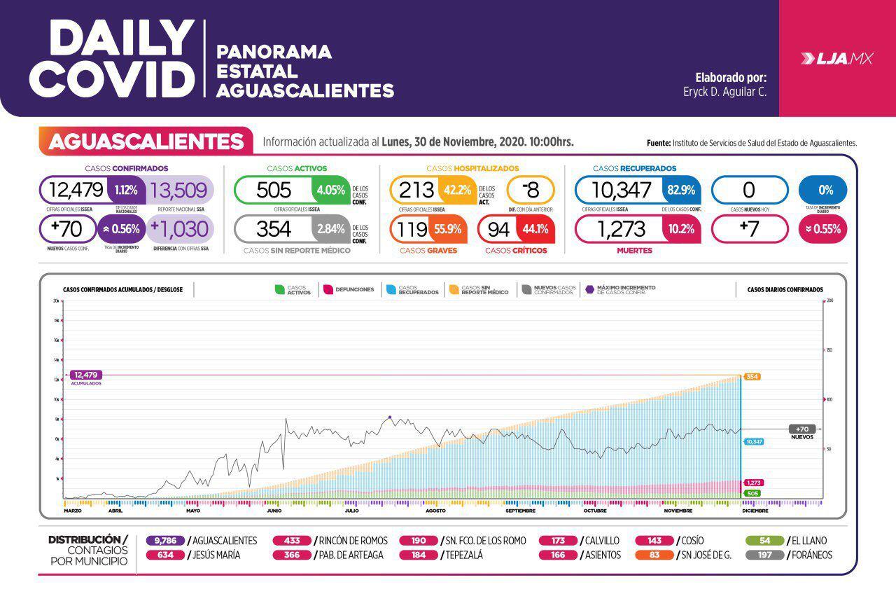 En el estado, al cierre de noviembre, hay 505 casos confirmados activos de COVID-19, más 354 sin reporte médico. 213 casos hospitalizados, de los cuales 94 están en condición crítica. En total, han habido 12 479 casos confirmados, 10 347 de esas personas se recuperaron. Lamentablemente, han fallecido 1 273 personas a causa de esta enfermedad.