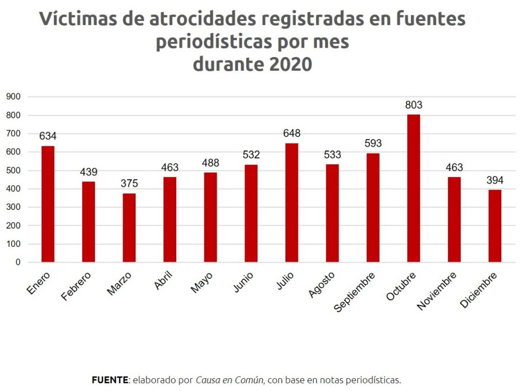 Durante 2020 se cometieron en el país, por lo menos, 5,380 hechos de extrema violencia que pueden ser clasificados como atrocidades, informó Causa en Común en su informe anual “Galería del horror: atrocidades registradas en medios periodísticos”.