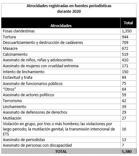 En las diversas categorías de atrocidades, se registraron 6,365 víctimas durante el año. Algunas categorías que aumentaron sus registros durante diciembre fueron el asesinato de funcionarios públicos, con 19 casos, contra seis del mes de noviembre; así como los casos de linchamiento, mutilación y terrorismo, que sumaron siete casos cada uno en el último mes, contra dos, uno y tres en el mes anterior, respectivamente.