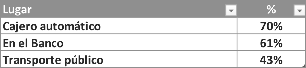 La percepción de inseguridad es mayor (ocho de cada diez) en los cajeros automáticos localizados en la vía pública, seguida del transporte público y los propios bancos; le siguen las calles que normalmente se usan, los parques y mercados, para notarlo menos en las carreteras, los centros comerciales y los espacios más privados como lo son el automóvil, el trabajo, la escuela, o la propia casa, donde extrañamente dos de cada diez se sienten inseguros.