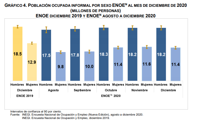 La población ocupada informal, que comprende a los ocupados que son laboralmente vulnerables por la naturaleza de la unidad económica para la que trabajan, como aquellos cuyo vínculo o dependencia laboral no es reconocido por su fuente de trabajo, en el caso de los hombres se observa un nivel similar en la ocupación informal entre noviembre y diciembre de 2020, de 18.2 millones de personas. En las mujeres, la ocupación informal tuvo un descenso de (-)285 mil personas en el mismo periodo.