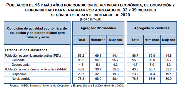 Durante diciembre de 2020, la población ocupada fue de 52.8 millones, cifra menor en (-)95 mil personas a la de noviembre del mismo año. La población ocupada de hombres fue de 32.3 millones, cifra inferior en (-)170 mil personas a la de noviembre y la población ocupada de mujeres fue de 20.5 millones, 75 mil personas más en el mismo periodo. En cuanto a la población ocupada en el agregado urbano de 32 ciudades la cifra corresponde a 22.8 millones de personas, de las cuales 13.3 millones son hombres y 9.5 millones son mujeres.