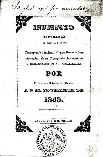 José María me explicó que la copia del documento que me acababa de obsequiar lo había localizado en la notaría del templo de San José de esta ciudad, donde según me dijo se conservaba mucha información liberal por ser un lugar donde, en épocas difíciles, solían celebrar sus reuniones las logias masónicas en el siglo XIX. Se trata de un folleto de 12 páginas editado en la imprenta de José María Chávez, que en su carátula lleva el título de Instituto Literario de Ciencias y Artes y en la parte inferior la fecha 20 de Noviembre de 1848.