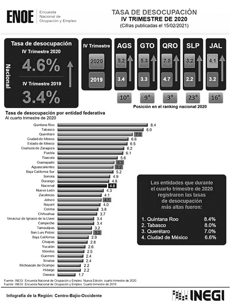 De acuerdo con la Encuesta Nacional de Ocupación y Empleo ENOE de Inegi, tenemos que Aguascalientes presentó, al 4° trimestre del 2020, una tasa de desempleo del 5.2% en una situación nacional del 4.6% y encontrándose entre entidades colocadas entre el 3er y el 23 lugar a nivel nacional en tasa de desocupación (Querétaro y San Luís Potosí).