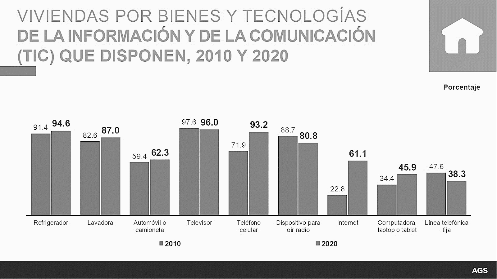 En Aguascalientes se ha incrementado el porcentaje de algunos bienes. En una década en el caso de las tecnologías para las TIC´s, apenas se ha aumentado un tercio el uso de las computadoras, pero los servicios de internet ya se han triplicado en el estado y duplicado en el país.