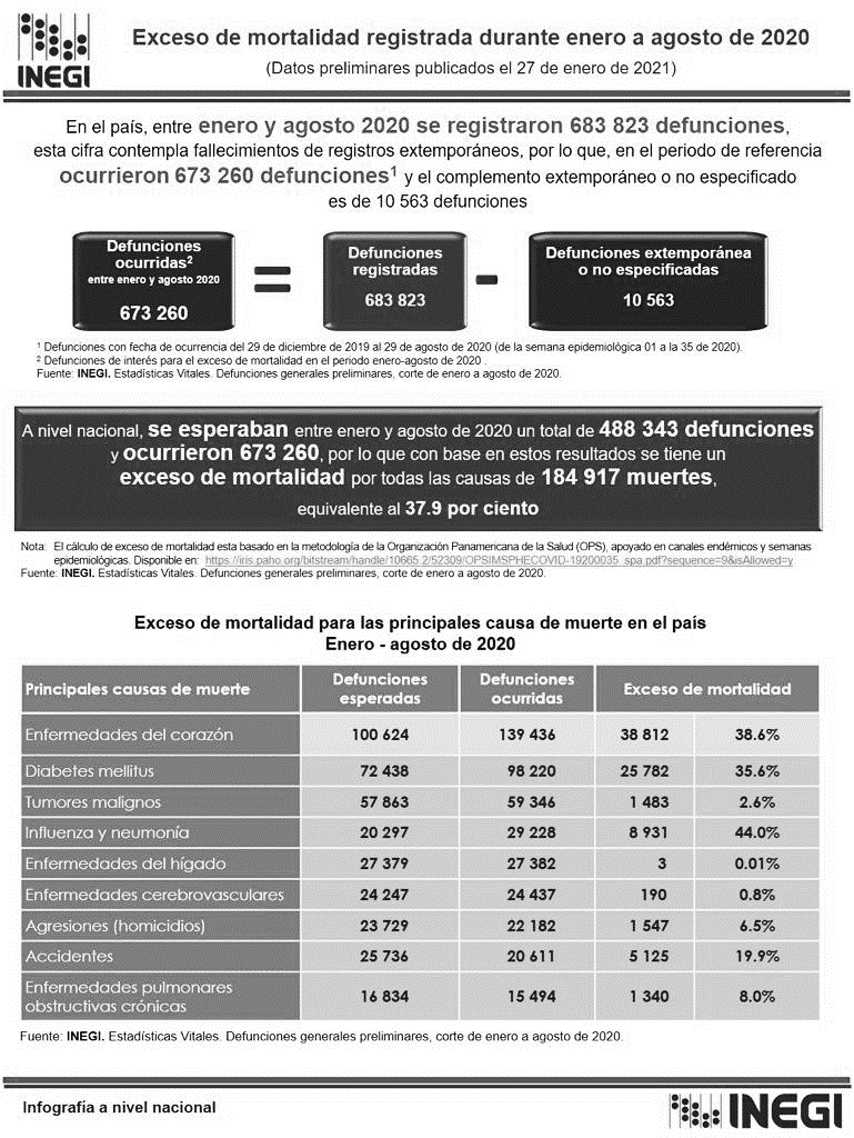 En México, entre enero y agosto del 2020, se registraron 683 mil 823 defunciones, esperándose para ese lapso de tiempo tan solo 488 mil 343. Se considera un exceso de mortalidad las 184 mil 917 muertes restantes; con 10 mil 563 defunciones extemporáneas o no especificadas.