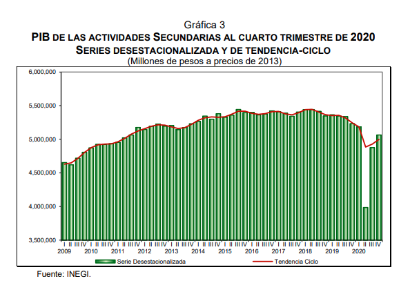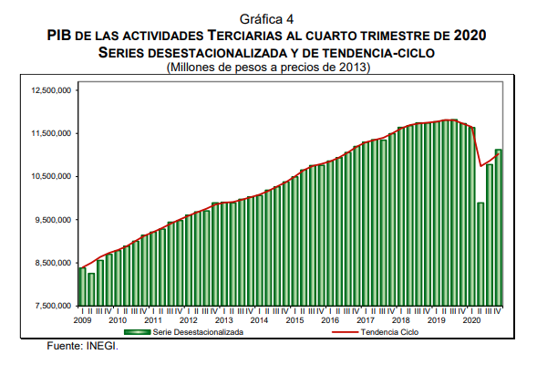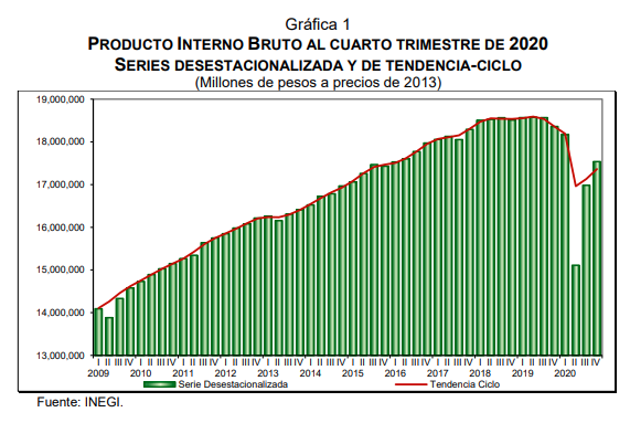 El Inegi presenta los resultados del Producto Interno Bruto (PIB), los cuales indican un aumento de 3.3% en términos reales en el trimestre octubre-diciembre de 2020 respecto al trimestre precedente, con cifras ajustadas por estacionalidad.