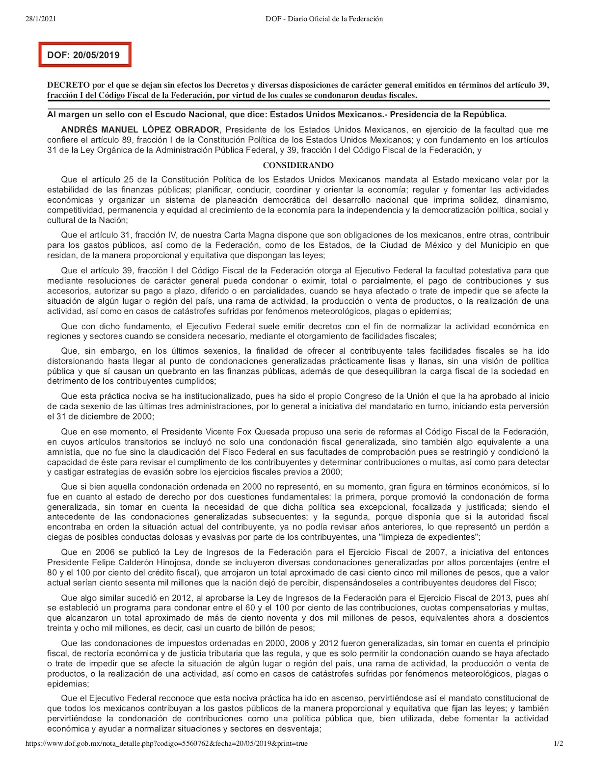 Pese a que ha sido habitual que la Secretaría de Hacienda y Crédito Público (SHCP) condone multas por infracción a las disposiciones fiscales, bajo lo dispuesto en el artículo 74 del Código Fiscal Federal, el presidente López Obrador publicó en mayo de 2019 un decreto que indica explícitamente que el Ejecutivo Federal se compromete a “no otorgar condonaciones” o a eximir, total o parcialmente, el pago de contribuciones.
